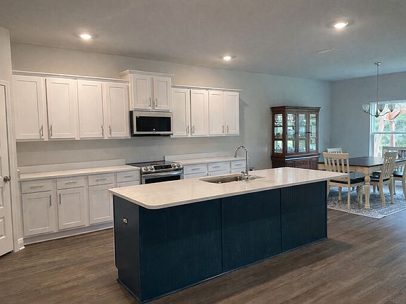 Upgraded Hawthorn plan in Jubilee Farms offering modern style, premium upgrades, and exceptional privacy. The bright white and blue kitchen features quartz countertops, a custom backsplash, Samsung Bespoke white glass appliances, and smart lighting throughout the home. Custom built-in shelving and storage enhance the living areas, and all three walk-in closets include custom shelving systems.