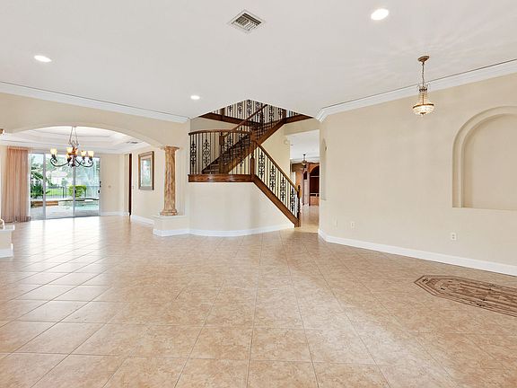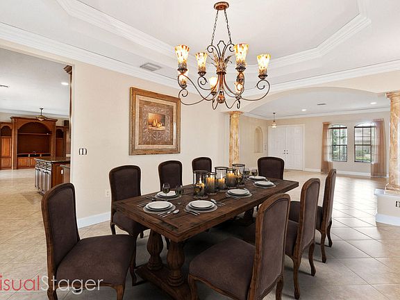 Elegance and grandeur are evident in this stunning 6 bedroom, 4 bath pool home situated on a cul-de-sac. The dream kitchen features 42'' cabinets, under and above cabinet lighting, granite countertops, tiled backsplash, stainless steel appliances, a double oven and a center island. Exquisite master retreat with a coffered ceiling, sitting room, his and hers walk-in closets and French doors that lead to the covered veranda. Opulent master bath boasts dual sinks with granite counters, a Roman tub and a walk-in shower. Bedroom #3 offers French doors leading to a covered balcony. Neutral tile laid on the diagonal, crown molding, upgraded stair railings and accordion shutters complete this come. Enjoy your own tropical paradise with a covered patio, custom pool, spa and a stunning lake view.