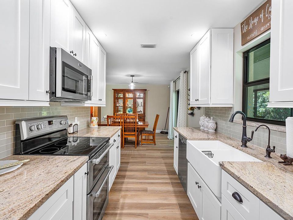 WELCOME HOME!!! This well maintained 3 bedroom 2 full bath 1 car beauty boasts countless brand new and newer items. Such as; hurricane impact windows and doors, fully renovated kitchen featuring granite counters, glass backsplash, Maytag stainless steel appliance package, double oven, soft close draws and doors, 42'' cabinetry, reverse osmosis sink system and amazing farm sink, wood plank ceramic flooring and large 4 1/2'' baseboards throughout and newly stucco and painted exterior. Passing through you will discover a split floorplan, elegant master suite with a walk-in closet, updating throughout, flat finish ceiling and walls, gorgeous solid wood doors and enormous 40' x 12' lanai over looking the backyard oasis. STEPPING OUTSIDE you will discover, a premium (click)