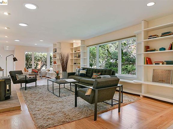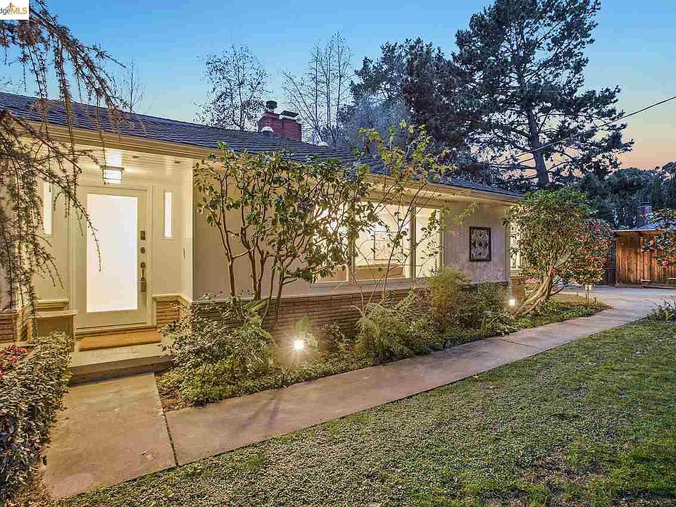 Sleek mid-century with big entertaining spaces and easy flow, on private half-acre. Comfortable updated kitchen with granite counter, artisan range and SubZero fridge. A generous eat-in area steps out to a relaxed porch and dining patio below. The warm dining room with vaulted ceiling lures you back inside. Downstairs is a large office and sleeping space, with adjacent utility room suggesting expansion possibilities. Numerous crafted shelves and nooks make this an ideal home for displaying artwork, books, and collections. Great spaces for makers and craftspeople. Endless amounts of storage options in basement, attic, and garage. Set on tree-studded grounds with woodland paths, sunny patios, tree house, greenhouse, and pool. A country block to the Chabot Park trail system; a quick dash down the hill to freeway and transit.