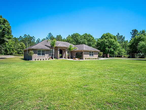 Experience the privacy and serenity of country living. Appreciate the security and convenience of the fenced yard with automatic solar powered gate. As you start up the long rock drive, enjoy the luscious green grass and large oak trees. Park on the large concrete pad perfect for basketball or other outdoor activities. Head down the sidewalk admiring the fresh landscaping and the tranquility of the custom water feature as you come up on a beautiful set of iron doors. As you enter the foyer notice the stunning hardwood floors and large living room. Notice the natural light from the many windows in the back of the house, especially in the breakfast nook area, where you can sit and enjoy watching a variety of wildlife such as: deer, rabbits, hummingbirds, turkeys, quail, blue jays and cardinals. Our Andersen sliding glass doors open up to a perfect blank canvas for adding a future pool/outdoor entertainment area. We have owned the property since 1997 and built our home in 2002. Our centralized location on 301 offers conveniences to Jacksonville, Baldwin and Callahan. Bryceville has its own fire station (part of Nassau County Fire & Rescue) just 3 miles away as well as a public library, post office, ball park and “A” rated school. We are also adjacent to Carey State Forest and a short drive from the Jacksonville-Baldwin Rail Trail. This home has a front yard sprinkler system, whole home water softener & tankless water heater. Master suite has a walk-in his/hers closet, extra linen closet, on-suite master bathroom with large garden tub, separate shower and toilet room. 2nd and 3rd bedrooms are located on the opposite side of the home with a 2nd bath/shower that includes a linen closet. An additional linen closet is in the hallway between the bedrooms. The private office is a great space for work or even a fitness area. All appliances are included. To schedule a visit please call 904-887-2420