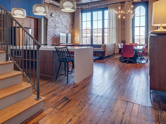 1 bed/ 2 bath renovated loft with river views and 20 ft. ceiling comes fully furnished with an upstairs Master bedroom and ensuite bathroom. Spacious open floor plan with big screen HDTV in living room, full kitchen and dining room and full bathroom downstairs. Historic Market Street Emporium Building located close to all downtown attractions. One parking pass to Commerce St. Garage provided and utilities included. Access to onsite laundry facility. No pets. Minimum 3 month lease.