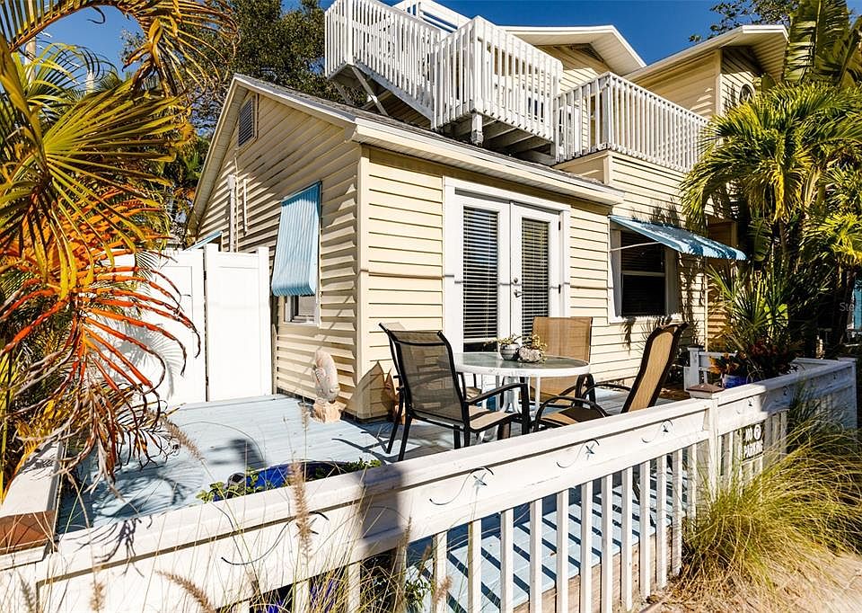 The perfect beach house!! Just steps from gorgeous and in-demand Sunset Beach in Treasure Island sits this charming beach hideaway featuring 2 bedrooms, 2 Baths, multiple decks to enjoy the surroundings and GULF VIEWS, as well as an attached garage!!! The gracious ground floor features an eat in kitchen with marble counter tops and living room with french doors opening to the ground floor deck, a main floor bedroom and access to the shaded rear patio with hot tub - a true oasis of shaded calm just steps from the water! The second floor is dedicated solely to the Master Suite, complete with walk out to a second floor deck with a stairway that leads up to the stunning gulf views on the deck - no better place for enjoying our famous sunsets in true Florida style!!! Newer roof, 2020 AC and UPDATED ELECTRICAL make this lifestyle investment and easy decision. With multiple restaurants just doors away, many more just blocks away, and a nearby Publix for stocking up, this home is perfectly positioned for enjoying the true beach lifestyle. Bordered by St Pete Beach to the south and Madeira Beach with Johns Pass to the North, Treasure Island is in an ideal location for making life a vacation! Easy access to 2 excellent airports, as well as a short drive to booming Downtown St Petersburg and just a little further to Tampa make life easy and filled with entertainment options year round - don't miss your opportunity to take advantage of all the area has to offer from this perfect beach home, sold furnished for convenience of Seller and ready for the next owner to enjoy!!!