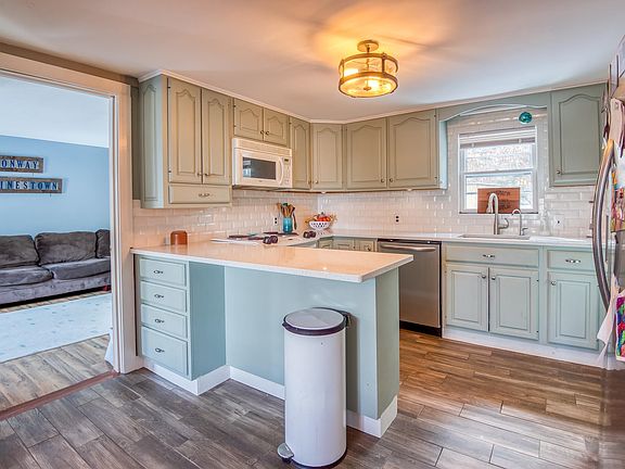 Don't be fooled by the GPS—this 3-bedroom home is just over the line in Madison, mere seconds away from Conway Village and a short drive to the restaurants and shops of North Conway. The current owners have made several updates inside and out! As you approach the driveway, you'll notice new stairs and a new front door. Inside, the once closed-off dining room has been opened up to the kitchen, which boasts new granite countertops, a backsplash, and flooring, along with several new appliances. The living room is a spacious entertainment area centered around a beautiful wood-burning fireplace. Additionally, the first floor features a bonus room off the kitchen that is perfect for an office, playroom, or second living room. All three bedrooms are located on the second floor, including a large master bedroom with its own walk-in closet and propane fireplace. During the warmer months, entertain guests outside in the fully fenced backyard, complete with a 20x15' concrete patio for your deck furniture and grill. New sod was installed throughout the backyard in 2021 and is well-established. The best part? The quiet woods of SOLO Wilderness School border the rear, ensuring you can enjoy the peace and quiet of your backyard for years to come.