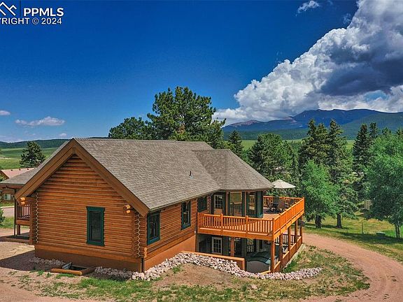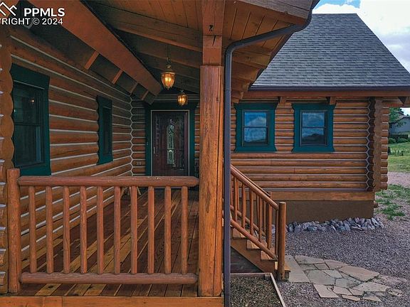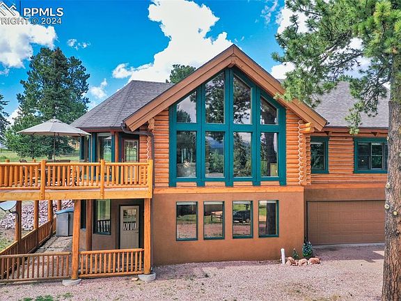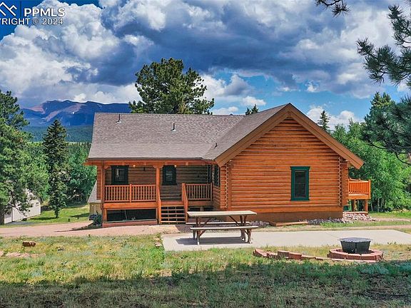 Discover rustic elegance in this true log home that features well-maintained 9" Swedish Cope logs and is set on a serene 1/2 acre at the end of a quiet cul-de-sac. Pride of ownership is obvious here. The open concept living area features vaulted ceilings and beautiful views of Pikes Peak, creating a perfect backdrop for both relaxation and entertaining. The main level boasts a spacious master suite with a newly updated 5-piece bath, and an additional bedroom and full bath. Enjoy seamless indoor-outdoor living with a newer composite deck accessible from the dining area, perfect for alfresco dining or simply soaking in the outdoors. New flooring throughout the home enhances its modern appeal while preserving its cozy charm. Downstairs, find two more bedrooms, a full bath, and a recently updated laundry room. The lower level also offers direct access to the garage, adding convenience and functionality. The front porch features a beautifully refinished redwood deck, ideal for morning coffee. A circular driveway adds to the home's welcoming feel, while the location offers the best of both worlds: the tranquility found in mountain living and you're less than 10 minutes to Woodland Park or national forest trails. The home has 2 furnaces, allowing individual temperature regulation on each level and the water heater was just replaced. This home is a perfect blend of comfort, style, and natural beauty. Don't miss this opportunity to own a piece of Colorado paradise.