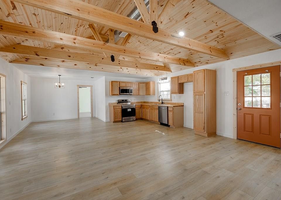 Located in Elkhart ISD, this beautiful 1.5 story home built in 2024 sits on nearly an acre and blends rustic charm with modern comfort. Inside, you'll find vaulted ceilings with exposed wood beams, a tongue-and-groove pine ceiling, spray foam insulation between ceilings, and luxury vinyl plank flooring throughout. The open-concept kitchen features custom cabinetry, butcher block countertops, stainless steel appliances, and a farmhouse-style sink overlooking the backyard. The primary suite offers a spa-like bathroom with a walk-in shower accented by marble-style tile, while the guest bath includes a tub/shower combo with coordinating finishes. Relax on the spacious front porch or take advantage of the detached shop, perfect for a workshop or storage. Adding even more versatility, this property includes a charming tiny home with one bedroom and a full bathroom — ideal for guests, extended family, or rental income.