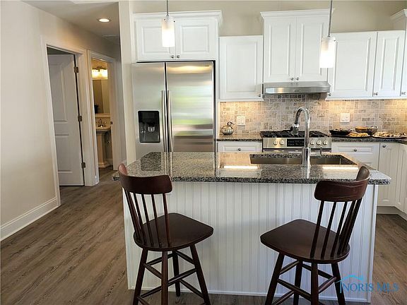 New custom ranch with park and Lake Erie views. Vaulted ceilings. Gas fireplace w/remote. 2 full baths, 3 bedrooms. Extra wide molding, laundry room. Open floor plan. Recessed lighting, granite counters w/deep sink, pendants over island, solid core doors, wood cabinets,w/ solid doors & face, wired for sound system, remotes/dimmers on all fans, keyless entry from garage, cable in living room and master, master bath tiled shower, guest bath tub.