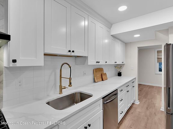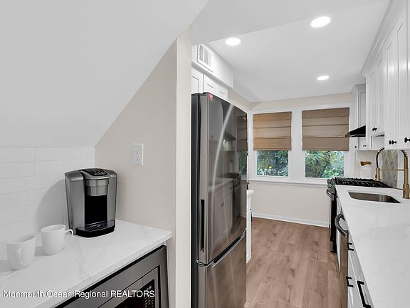 Step inside and discover an Eat-in Kitchen that will leave you in awe. With sleek finishes, elegant gold accents, and a chic stove backsplash, it's a true chef's paradise. Brand new stainless steel appliances, luxurious Quartz countertops, and a stylish Coffee Station/Bar Area complete this culinary haven. You'll adore the Kings cottage oak large-planked flooring, both waterproof and pet-resistant, that runs throughout the entire home. Prepare to be pampered by the stunning bathroom, featuring seamless shower doors and sleek black hardware and fixtures. Both bedrooms offer a comfortable retreat, boasting flush-mounted caged ceiling fans with integrated lighting. For added convenience, a brand new Washer & Dryer is situated on the second floor, making laundry a breeze. As you venture outside, the spacious fenced-in backyard is a blank canvas, awaiting your creative touch to transform it into your personal oasis.This prime location places you close to everything Shrewsbury has to offer, from the vibrant downtown to shopping, delectable restaurants, and easy access to the train to NYC. Don't miss this chance to make this contemporary haven your new home!"