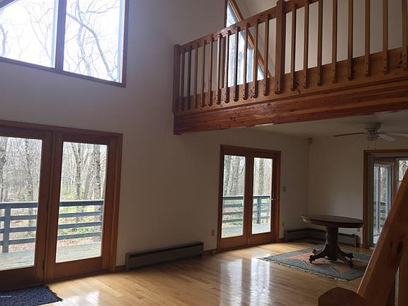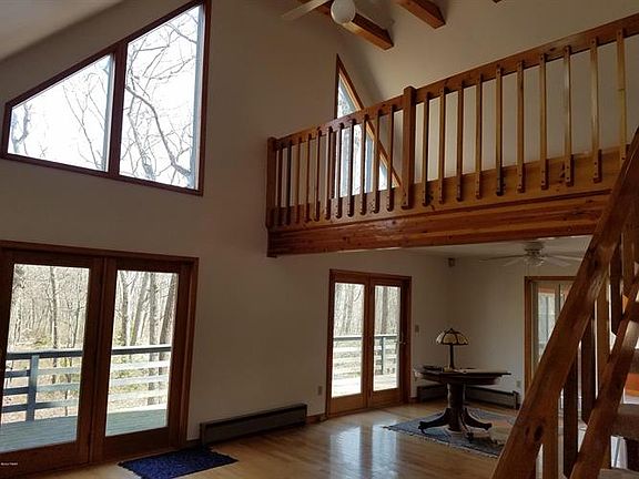 PRIVATELY SET CONTEMPORARY CHALET HOME WITH FULL FINISHED BASEMENT ON 2.77 ACRES AND BACKS TO 2900 ACRES OF NATURAL FOREST! This immaculate home offers the ultimate in privacy! Enjoy the abundant wildlife from the expansive deck or from the 3 Season Pocono Room. Open floor plan featuring 3 bedrooms, 3 baths, kitchen with snack bar, great room with brick-propane fireplace, loft area, hardwood floors, and a Master suite with private en suite bath. There's also a full finished walkout basement with family room, utility shed, and so much more to add to the enticing features of this amazing home. WELL MAINTAINED, THIS HOME IS IN MOVE IN CONDITION! LOW TAXES MAKE THIS THE RIGHT CHOICE FOR YOU!