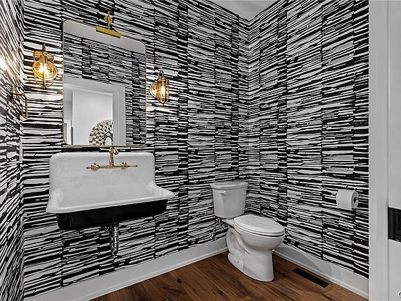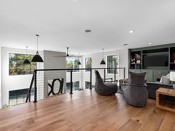 2022 Parade of Homes Midnight. This home has a modern industrial design aesthetic with exposed steel, cable railings, brick accent walls, GE Cafe appliances, black kitchen cabinets, floating staircase, large home office, hard board siding, quartz countertops, heated tile floors, 3 car tandem style garage and more