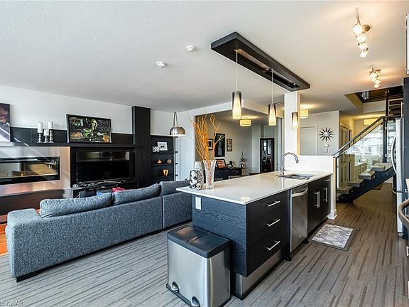 Your new home awaits, high atop of the Arrow Lofts. Steps to Victoria Park, City Hall, Ion LRT & the Kitchener Tech Hub. This stunning 2 story, west facing Penthouse boasts a lot of light with its 2 story wall of windows. Close to 2,000 sq.ft. of luxury living and a kitchen sure to bring the gourmet out in you. Upgraded hi-gloss white cabinetry with black Oak accents, quartz counters & stainless appliances are a few of the features. Relax with a glass of wine in front of the built-in fireplace. The hard wood floating-tread staircase delivers you to the second floor media space, an ideal spot to work or relax where more than a single den/office is required. The west facing master bedroom leads to a walk-through closet with custom built-in organizers and shelving, then on to the en-suite bath with marble treatments, upgraded fixtures, separate jetted tub and glassed shower. The second level also conveniently houses the in-suite laundry with full sized washer, dryer and laundry tub, 4piece bath,& air-handler dedicated to the second floor only. Condo living is more than the space you call home. Arrow Lofts amenities are second to none. Offering conference rooms, the library, theatre, roof top lounge, patio with gas BBQs, sauna, exercise room and visitor parking.