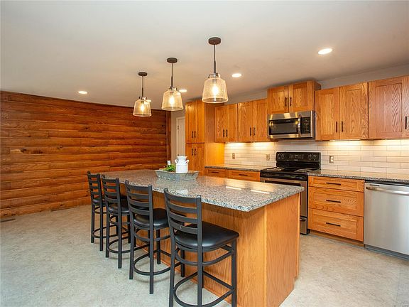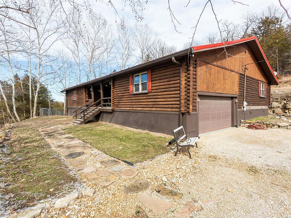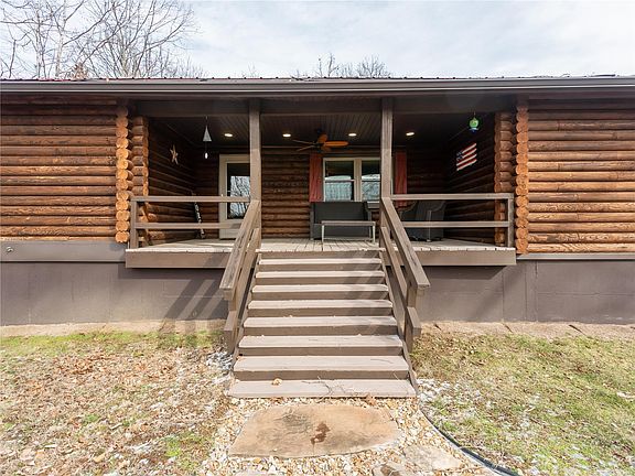 Gorgeous log cabin!! Looking for acreage for horses, great hunting & your own personal creek? Well.. all of that & more is right here! This 2500+ Sq ft log home is nestled quietly in the middle of approximately 12 acres & is about a 70/30 mixture of pasture & woods. Enjoy beautiful sunset views from your covered front porch or listen to the rain bounce of the new metal roof. The new kitchen has numerous cabinets w/ the soft close feature, an 8 ft center island/breakfast bar, custom lighting, farmhouse stainless sink, & new stainless steel appliances. New Porch soffit, lighting and fan in 2021! All flooring except the family room is either luxury vinyl tile or laminate. Don't miss the newer high efficiency HVAC, the wood boiler that is alternative for heat and hot water and clean as a pin 4 ft crawl space. New detached garage w/ lean too installed in July of 2021. The garage has RV hook up, insulated garage doors, waste oil furnace and enough room to drive completely around it!