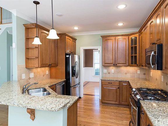 Custom built Home w/bsmnt! Lake views from rear windows (breakfast, fam rm, MBR, bsmnt, etc.) N'borhood pool just a few drs down. Stone steps, leaded glass door + transom, 2 story foyer, wood flrs w/inlaid detail, Crown thru-out, dble glass dr entry to office w/cathedral ceiling + built in bookcases, secondary bdrm has dble closet. Kitchen offers Gas range, 2 pantries, granite, SS appl. HUGE deck w/patio below from Walk Out Bsmnt w/full bath & wet bar, game rm + fitness room or use for in-law ste.