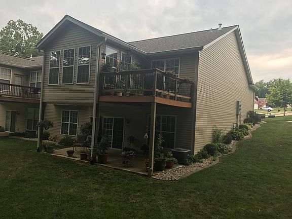 END UNIT VILLA BACKS TO TREES/WOODS Fabulous villa has it all! Great room! Dining combo has wood flooring, bay window, cathedral ceiling and gas fireplace. CUSTOM KITCHEN features up-graded cabinetry, granite counter tops, tile floors, range, refrigerator, dishwasher and microwave. 4-SEASONS SUN ROOM off of kitchen offers multitude of windows and view of lake and walking trails. MASTER SUITE has cathedral ceiling, walk-in closet and private bath with whirlpool tub and separate shower. Main level laundry. WALK-OUT LOWER LEVEL has gas brick fireplace, 3rd bedroom, full bath, wet bar, and 2 large storage areas. NEW ROOF, SIDING, GUTTERS , SCREENS & MAILBOX. (in process, due to hail storm) BEAUTIFULLY DECORATED AND MAINTAINED!