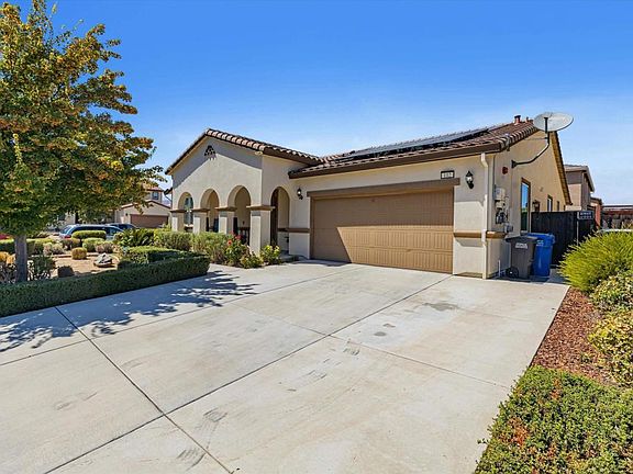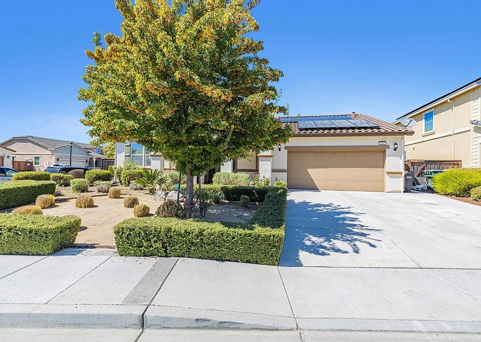 SINGLE story, 2356 sq ft home with owned solar and addition leased solar. It is located in a corner lot. Fruit trees on the side - guava, lemon, orange and grapefruit. Jack & Jill bathroom that connects to 2 large bedrooms. Big hallway that leads to the great room and kitchen. 2 car garage attached and ready EV connection. 3 car parking in front of the garage. Kitchen center island with ample seating and dining area is roomy for an extended table and opens up to the great room. Master bedroom is on the other side with a separate soaking tub, shower, a roomy bathroom with double vanities and a large walk-in closet. Front desert landscape. Stamp cement in the backyard and one side by the side door outside. Rear yard with covered patio right by the kitchen. Highly desirable neighborhood.