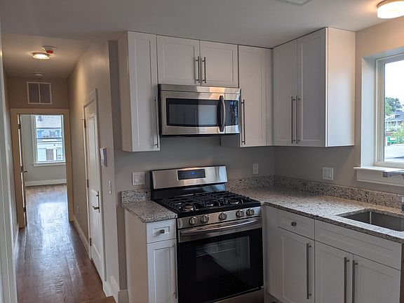 Deluxe top floor 7 room, 4 bedroom apartment COMPLETELY RENOVATED, all brand new Gorgeous dark hardwood floors, all recently painted a nice shade of grey. Knock your sox off Kitchen and 2 marble and tile bathrooms. Full size stack washer and dryer in the unit. Modern lighting. Stainless Steel and Granite Kitchen. 2 living rooms or Living and Dining. All bedrooms are a nice size and very equal. Nice Closet space. Central AC and brand new efficient heating appointed with new windows and fully insulated. The exclusive deck is very large in the back off of 2 of bedrooms. At $4,000 this is a very good value for the space and the location. Available for immediate occupancy. Don't MISS