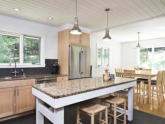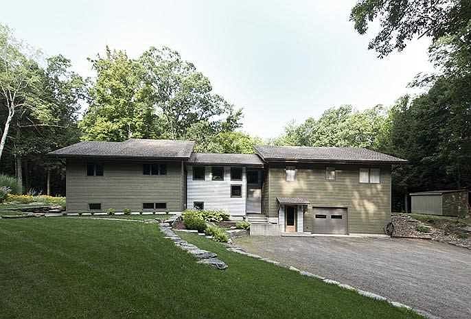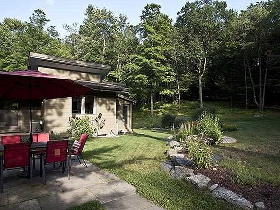 This custom contemporary with an industrial flare was built by a master carpenter and is the perfect weekend getaway. Drive over the babbling brook past the detached garage to the meticulously landscaped private 5+ acres. The front foyer brings the outdoors inside, with abundant natural light illuminating beautiful attention to detail. Gourmet eat-in kitchen with top-of-the-line stainless steel appliances & granite countertops. Cozy living room with gas fireplace leads out to the three-season sunroom. The spacious master suite boasts an oversized walk-in glass shower that also leads to the outdoor shower. The ensuite guest room is perfect for visitors, while the basement is large enough for your gym/family room and/or an extra bedroom. Easy access through the mudroom after parking in the attached oversized one-car garage. There are hardwood floors throughout the entire house with radiant heat. This is a must see!