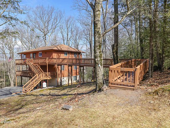 Step inside this updated lake house and enjoy seasonal lake views of Lake Wallenpaupack. This home offers a unique blend of rustic charm and contemporary convenience. Nestled among the trees, it exudes the cozy atmosphere of a secluded treehouse retreat. As you move through the home, large windows frame seasonal views of Lake Wallenpaupack, inviting the beauty of nature to permeate your living space. Enjoying a morning cup of coffee or unwind after a long day, on the wrap around deck amidst the trees. Inside, the kitchen and bathrooms have been tastefully updated to offer both style and functionality, ensuring your comfort and enjoyment. From sleek countertops to modern appliances, every detail has been thoughtfully chosen. Additionally, energy-efficient heat pumps have been installed, providing you with both comfort and cost savings throughout the year. Whether you're cozying up by the fireplace in the winter or enjoying the cool breeze in the summer, you can rest assured knowing that your home is equipped to keep you comfortable in any season. Welcome home to your own idyllic lake house retreat in Tanglwood Lakes.