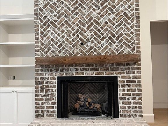 Stacked-brick fireplaceOpen-concept floor planWall of windowsCustom-built-in cabinetryOversized garage spacesBeautifully landscaped private backyardStainless-steel appliances