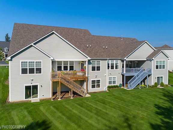 JUST LIKE NEW and FEELS LIKE SINGLE FAMILY HOME.. Post-market upgrades will have you saying...WOW! No expense was spared in this 4 bedroom, 3 1/2 bath RANCH with FULL FINISHED WALK-OUT LOWER LEVEL in HAWTHORN WOODS & MAINTENANCE FREE. Built in ONLY 2020, on a premium lot with an amazing backyard that backs to unbelievable nature views! Guests enter through a covered porch to the foyer revealing a stunning open floorplan of the living room/dining room/kitchen area. Recessed lighting with dimmer switches, white trim and gorgeous hardwood flooring can be found throughout most of the main level! Home chefs will appreciate the state-of-the-art stainless steel GE Profile and LG Inverter Linear appliances, custom 42" cabinetry with designer hardware, thick granite counters, walk-in pantry + oversized island and sink equipped with a Waterdrop Reverse Osmosis tankless system & breakfast bar seating for 4. Dining room includes slider door access to a raised deck overlooking the impressive treeline. Master suite features an enormous walk-in closet + private bath with dual vanity & oversized shower. Main level includes 2 additional generously sized bedrooms; each with walk-in closets & share a full bath with dual vanity. Spacious laundry/mud room leads to approx. 37'x21' 3-car tandem, finished garage with high ceilings and convenient dual laser parking guides. Lower level complete with a 2nd kitchen equipped with stainless steel appliances, floor to ceiling low-profile cabinet storage with lighting, a FOURTH BEDROOM with walk-in closet + FULL SPA BATH featuring a luxurious full body spray shower and steam-free LED mirror! Full finished walkout basement will be everyone's favorite place to relax and unwind in the incredible rec room with slider access to an expansive backyard. Huge storage room includes custom wood storage shelves throughout. Other features include: remote blinds in LR, DR, Office and MSTR suite + rigid waterproof vinyl flooring by Mohawk in walkout level, exterior with brick and Hardie Board siding and FIBER INTERNET! HOA includes: lawn, snow, roof, mulch and trimming of bushes in front yard, seal coat every other year and common insurance! THIS HOME IS A DEFINITE 10!!
