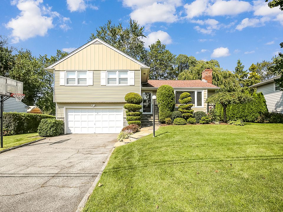 Move right in to this completely renovated, sun-filled split-level home with three bedrooms and two full and one half baths. The entryway leads to an open spacious living room and dining room with hardwood flooring and sliders to deck and beautifully manicured leveled backyard. Easy half flight of steps up to the large master suite, plus two additional bedrooms with hall bath. The finished lower level is great for those who want to have an office, gym, or hobby space.