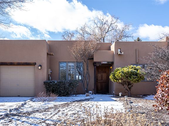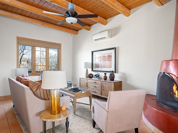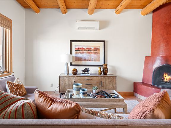 Tucked away in a peaceful enclave off West Alameda, 112 Del Rio is a 2-bedroom, 2-bathroom attached home offering a charming blend of Santa Fe style and modern convenience. Just 12 minutes from the historic Plaza, this attached townhome is a rare find—quiet, private, and with no HOA fees or restrictions. Step inside to find classic Santa Fe details, including vigas and a striking red plaster kiva fireplace, the perfect place to spend a cozy winter evening. The bright and airy living space is complemented by large windows, inviting in natural light and views of the serene surroundings and the Sangre de Cristo mountains. Recently installed mini splits create year-round comfort. The home is move-in ready with a well-appointed kitchen and a fenced backyard with a patio, mature trees, and drip irrigation. The primary bedroom has an en-suite private bath as well as back patio direct access. The Santa Fe River Trail is just moments away, with endless opportunities for walking and biking downtown (it’s only a 17-minute bike ride to the Plaza). With an attached one-car garage and easy access to the Plaza and the Railyard/Farmer’s Market as well as the Alameda neighborhood shops and parks, this Santa Fe gem is sure to inspire you.