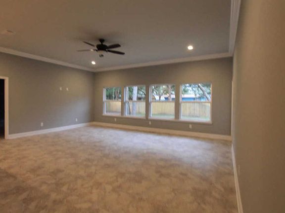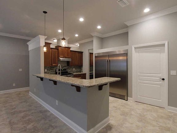 Awesome new floor plan by past parade of Homes, multiple award winner! This 4/2 custom brick home has super curb appeal. There are 10 ft. ceilings w/ impressive crown molding, tile flooring, and 5 1/4'' baseboard throughout the main living areas. As you approach the front of the home, you will be quite impressed. The covered porch is very welcoming, and the gorgeous 8 ft. leaded glass door, makes for a grand entrance. The formal dining room is at the left of the home's front and has an attractive arched entryway that leads to the kitchen. The chef's delight kitchen boasts custom maple cabinetry, granite countertops, a wet bar with beverage cooler, a large pantry,