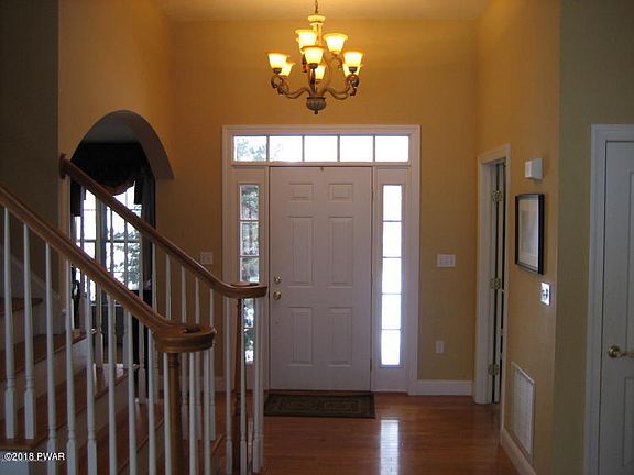 Stunning custom 2 story in highly esteemed Windsor Hills development offering location, privacy and convenience, and desirable North Pocono School District. Open floor plan leads you from eat in kitchen with breakfast island to 2 story great room with hardwood floors, tons of natural daylight and fireplace. Main level offers: master bedroom and master bath offering seclusion from main living areas, full laundry room, in home office, and formal dining room. Easy access to deck overlooking private backyard. 2nd floor offers 3 bedrooms and another full bath. Full daylight basement is rough plumbed for an additional bathroom and more living space if needed.