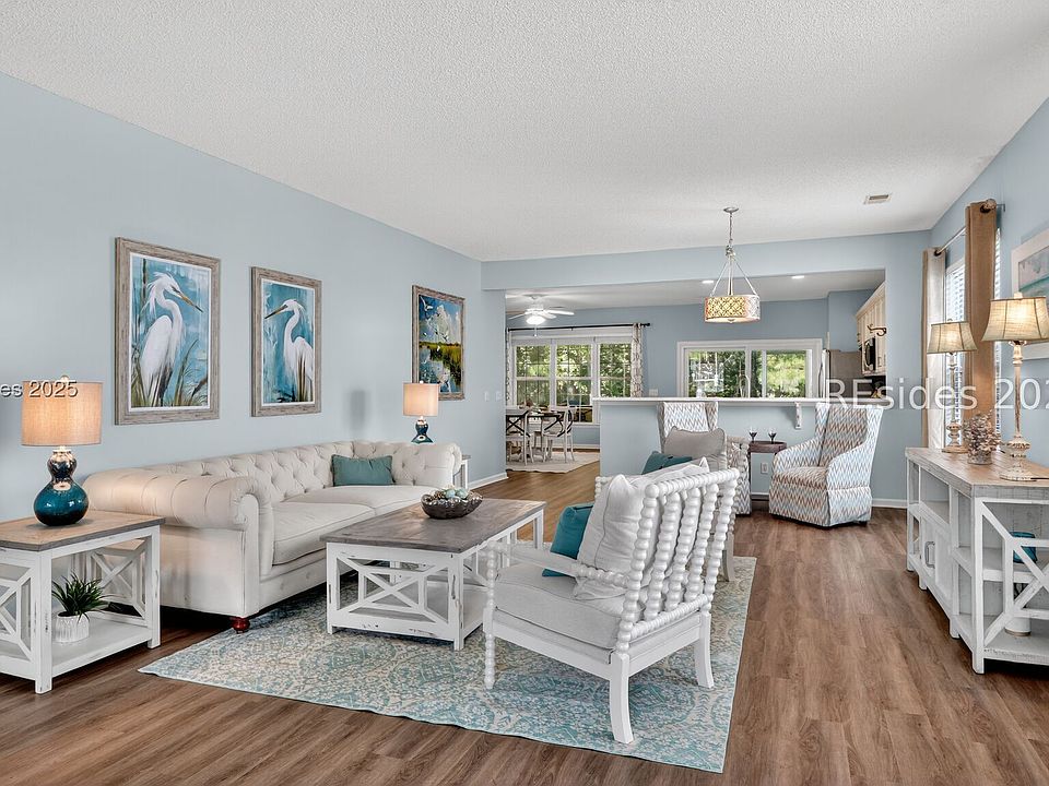 Beautifully updated, rarely seen, Teal model in Sun City Hilton Head featuring a Great rm, Carolina rm & lg office w/updated flooring, two bed, two bath, fresh int & ext paint, blinds, light fixtures, & fans. The kitchen features newer appls, countertops, sink, faucet, & painted cabinets. The primary bath has been fully renovated w/ gorgeous vanities, tile shower & floors. The guest bath is also beautifully remodeled. Enjoy the abundant closet space! The sliding glass door was replaced leading to the 12'x20' screened porch overlooking a private, wooded lot. Roof 2022, AC 2024, Leaf Filter Gutter Guards, & fresh landscaping. Move-in ready!