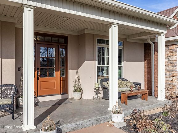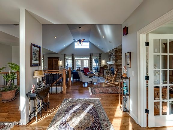 Beautiful home in desirable Tullamore Estates of Bardstown. 3 BR 3BA light-filled contemporary opens to a grand room with dramatic vaulted ceiling and open floor plan. Chef's delight kitchen with stainless appliances, large island, granite countertops and breakfast nook. French doors open to a large deck with scenic views of the yard and creek. Primary bedroom is a relaxing retreat with a walk-in closet, double vanity, garden tub and ample cabinetry. 2nd bedroom, full bath, 3rd sleeping area and formal dining room complete the first floor. Walk-out lower level features REC room with double sided gas fireplace, possible 4th bedroom, full bath, additional sitting areas, and patio. Unfinished area has abundant storage and utility garage. Come tour this one-of-a-kind home.