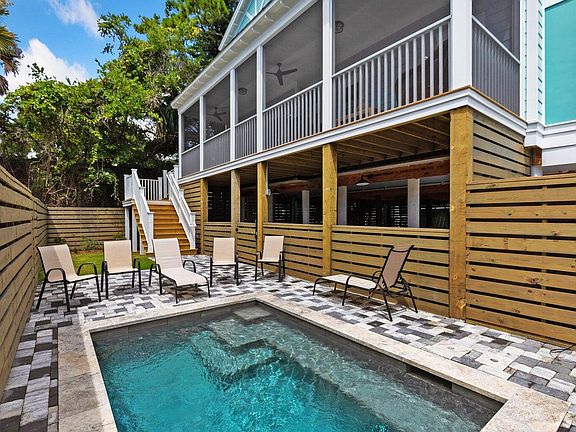 Mimosa Manor is an expansive seven-bedroom, six-and-a-half-bathroom home in the sought-after Sea Breeze Collection on Folly Beach. Designed for comfort, entertainment, and coastal luxury, this newly constructed property offers the perfect combination of space, style, and location. Just a short walk to the beach and Center Street's restaurants and shops, it is ideal as a primary residence, second home, or long-term investment.The first floor features an open-concept living, dining, and kitchen area with high ceilings, abundant natural light, and designer coastal finishes. The gourmet kitchen includes premium appliances, a large island, and a dining table that seats fourteen or more--perfect for hosting gatherings with family and friends.Five king suites feature en-suite bathrooms and private decks, offering privacy and comfort for guests. A spacious game room on the second floor includes a pool table, Smart TV, and cozy lounge area, creating a fun retreat for all ages. The remaining bedrooms include a bunk room with two twin-over-full bunks and an additional guest room with double beds, ensuring plenty of space for large groups. Outdoors, a private heated plunge pool provides year-round enjoyment and is complemented by a screened-in deck overlooking the pool an ideal setting for relaxing in the shade or entertaining. The home also offers private parking for up to seven vehicles, smart-home features, and modern security for convenience and peace of mind. Located just steps from Center Street and a short walk to the beach, Mimosa Manor allows easy access to the best of Folly Beach living. Downtown Charleston is only a short drive away, providing world-class dining, culture, and entertainment within easy reach. Fully furnished and move-in ready, Mimosa Manor combines modern design, energy efficiency, and coastal charm in one exceptional home perfect for those seeking a luxurious, low-maintenance lifestyle by the beach.