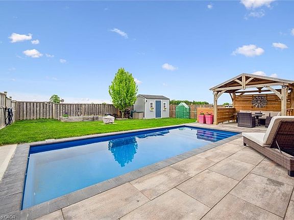 Charming Bungalow Backing Onto Greenspace with In-Ground Pool in Plattsville. Welcome to this beautifully maintained 3-bedroom bungalow built in 2014, located in the peaceful and family-friendly community of Plattsville. This move-in-ready home perfectly blends modern comfort and serene outdoor living. Step inside to a bright and spacious open-concept kitchen and living area, perfect for entertaining or relaxing with family. The kitchen features modern finishes, ample cabinetry, large pantry, and a seamless flow into the living space. Downstairs, you'll find a fully finished basement with a beautiful cozy fireplace in the Rec Room, abundant storage space, and a utility/laundry room (with more storage). The third bedroom, on the lower level, offers privacy and flexibility for guests, a home office, or a teen retreat. Enjoy the outdoors in your large, private deep backyard, which backs onto lush green space — no rear neighbours! The highlight of this outdoor oasis is the in-ground fiberglass pool (added bonus of no liner!), ideal for summer fun and entertaining and bbq’s on the deck. Have peace of mind with a whole home generator with auto-transfer so you never have to worry about power outages. Reverse Osmosis and Iron water filter also included for the best quality water. Don’t miss your chance to own this gem in a quiet, growing community just a short drive from Kitchener, Waterloo, and Cambridge.