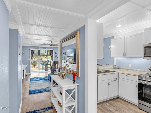UPDATED. GOLF NEXT DOOR. MINUTES TO THE BEACH. This 2-bed, 2-bath condo works beautifully as a primary home or a long-term getaway. Fully renovated from top to bottom, it's easily one of the nicest units in the entire building. The kitchen features granite counters, white shaker cabinets, stainless steel appliances, a beadboard ceiling with LED lighting, and a built-in surround-sound system. LVP runs throughout, and the enclosed balcony offers floor-to-ceiling glass that fills the space with natural light. HVAC was replaced in 2022; the water heater in 2021. The unit sits on the quiet west side of the building near the stairs. The building includes an elevator and laundry rooms on every floor, centrally located for convenience. You're right next to Holiday Golf Course, close to local restaurants, about four minutes from the beach, and only two miles from Pier Park. Walking trails and a peaceful residential setting make this an easy place to enjoy daily living. Everything you need is nearby, and the beaches of the Emerald Coast are a short drive south. The community includes a pool and a clubhouse beside it...an ideal spot for private gatherings. HOA dues are a low $445 per month and cover the community room, dumpster service, building insurance, management, pool, water, sewer, trash, and basic cable.