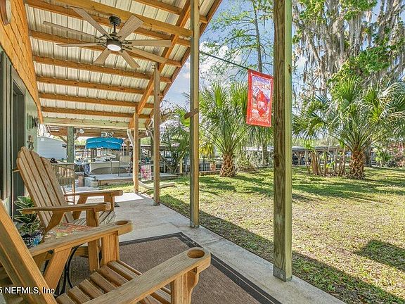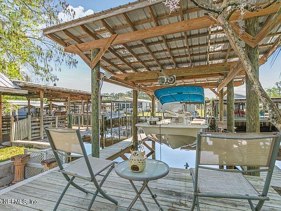 Welcome to 112 Fran Ln, a completely updated, move-in-ready concrete block home on the deepest canal in the community.Now offered mostly furnished. Perfect as a vacation retreat, rental investment, or weekend getaway, this home offers a stunning interior with fresh paint, new cabinets, butcher block countertops, and beautiful vaulted wood ceilings that create a warm and inviting atmosphere. Situated on over a quarter-acre, the exterior is just as impressive, featuring a huge carport, a covered front porch, a screened-in porch, and multiple outdoor spaces to relax and enjoy the waterfront views. Boating and fishing enthusiasts will love the covered boat house with a lift, a fishing deck, a sun deck, and a separate fish cleaning station with water. Additional storage options include a fully insulated and air-conditioned shed with electricity and an exterior storage room on the home. With great fishing right from the dock and easy access to Dunns Creek and the St. Johns River, this home is a true waterfront paradise.