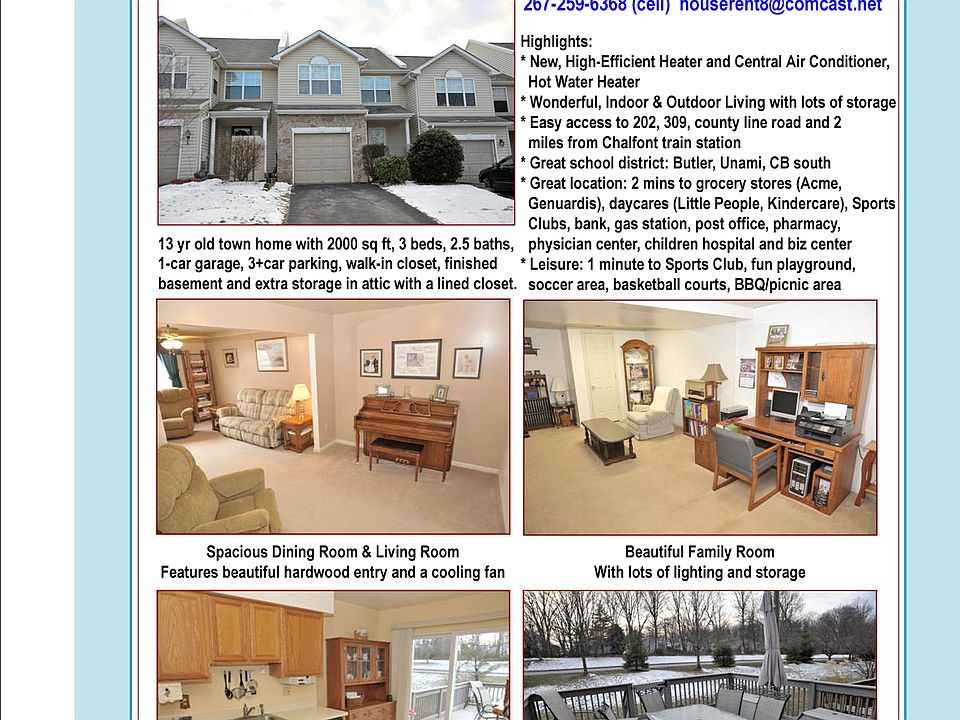 House is ready for moving in now!! Entire house is well maintained and sparkling clean. The carpet is shampooed. Some of rooms and baseboards are painted. Walls, windows, window sills, shades, doors, door frames, cabinets, appliances, bathrooms are all thoroughly cleaned. Deck, siding, front porch are powder washed. Bushes are trimmed. Please contact Linda at the phone number in the lease description section if you are interested in renting! First in first get it. Entire house is well maintained and sparkling clean. Ready for moving now! Welcome to this wonderful townhouse in the Highlands! With a convenient location, great school district, and big room space, you will find that this is the home you are looking for! The house has 2000 sq ft, 3 beds, 2.5 baths, 1-car garage, 3+car parking, walk-in closet, finished basement and extra storage in attic with a lined closet. Highlights: * Newer Washer and Dryer; Refrigerator; Microwave and Dishwasher * Newer High-Efficient Heater and Central Air Conditioner, Newer Hot Water Heater * Wonderful, Indoor & Outdoor Living with lots of storage * Easy access to 202, 309, county line road and 2 miles from Chalfont train station * Great school district: Butler, Unami, CB south * Great location: 2 mins to grocery stores (Giant), daycares (Little People, KinderCare, Chesterbrook Academy), Sports Clubs, bank, gas station, post office, pharmacy, physician center, children hospital and biz center * Leisure: 1 minute to Sports Club, fun playground, soccer area, basketball courts, BBQ/picnic area Description: * Spacious Dining Room & Living Room; Features beautiful hardwood entry and a cooling fan * Beautiful Family Room; With lots of lighting and storage * Eat-In Kitchen with Sliders to Deck; Fridge, oven, dishwasher, garbage disposer and microwave * Huge Terrific 20 x20 Trex Deck; With gate and built-in benches Location: * Chalfont close to North Wales, Landsdale, Dolyestown, Colmar, Merk, West Point SEARCH KEY... Lansdale, Hatfield, Horsham, Warrington, Upper Gwynedd, Lower Gwynedd, Dolyestown, North Wales, Chalfont PA 18914