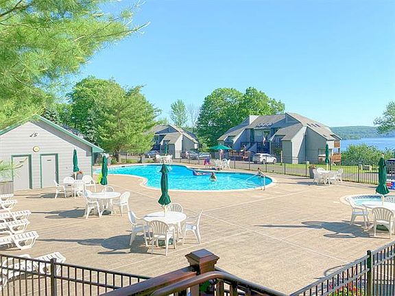 Lakefront condominium on Lake Wallenpaupack with amazing lake views and deeded boatslip! Enjoy maintenance-free living as your dues cover exterior maintenance, water, sewer, garbage, landscaping, lawn care, and snow removal to your front door! This unit has an open floor plan with 3 bedrooms and 3 bathrooms, large living room with wood fireplace, master bedroom with its own deck and bath suite, family room, pool room, and your very own bar area overlooking the lake! Amenities include pool area with plenty of seating, tennis courts, Bocce Ball court, basketball hoop, and a playground for the kids.