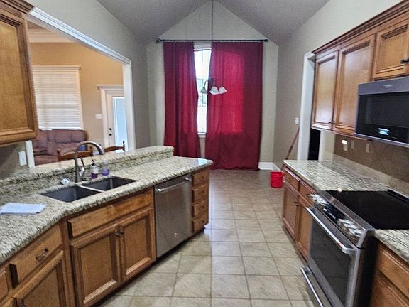 - A well-equipped kitchen featuring modern appliances including a refrigerator, electric range, dishwasher, microwave, and garbage disposal.