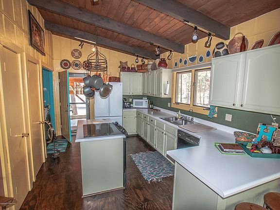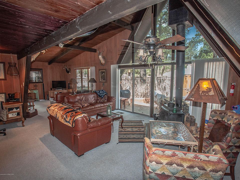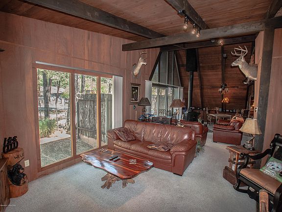 HAPPY ENCHANTED HILLS DELIGHT! Classy mountain style home in the heart of Ruidoso and close to the Links walking trail and golf course. Easy year round access. Discover the values in this well-maintained, metal-roofed 3 BR/2 BA residence with family and living areas, on a wooded corner lot. Offering free standing wood stove, high vaulted wood accented ceilings and wood flooring. Fine master suite-loft style bedroom. Desirable carport with storage and workshop area, enclosed coyote fenced-flagstone patio for outdoor living and decks. Nest programable thermostat with central heat and air conditioning. Security cameras too. Fully furnished.