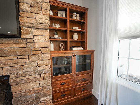 - Interior Features: Built-in Bookcase, Ceiling Crown Molding, Fireplace Gas, Inside Storage, Kitchen Island, Smoke Detector, Walk-in Closet, Washer/Dryer Hookup, Woodwork Painted, Woodwork Stained, Breakfast Bar, Split Bedroom, Ceiling Raised, Pantry, Pull Down Stairs, Ceiling Treyed/Coffered, French Door, Lighting Recessed, Shelving