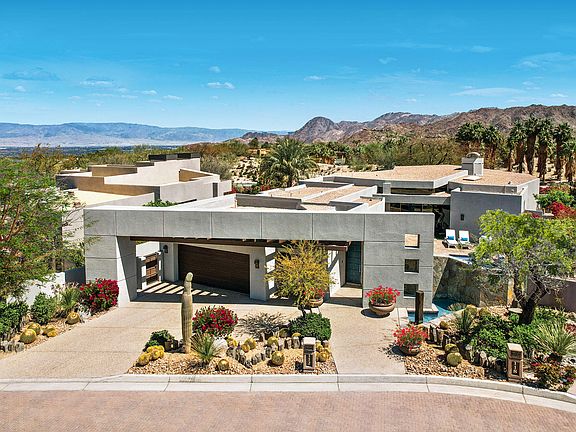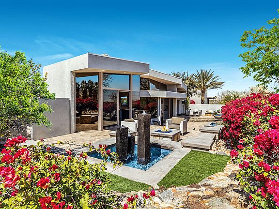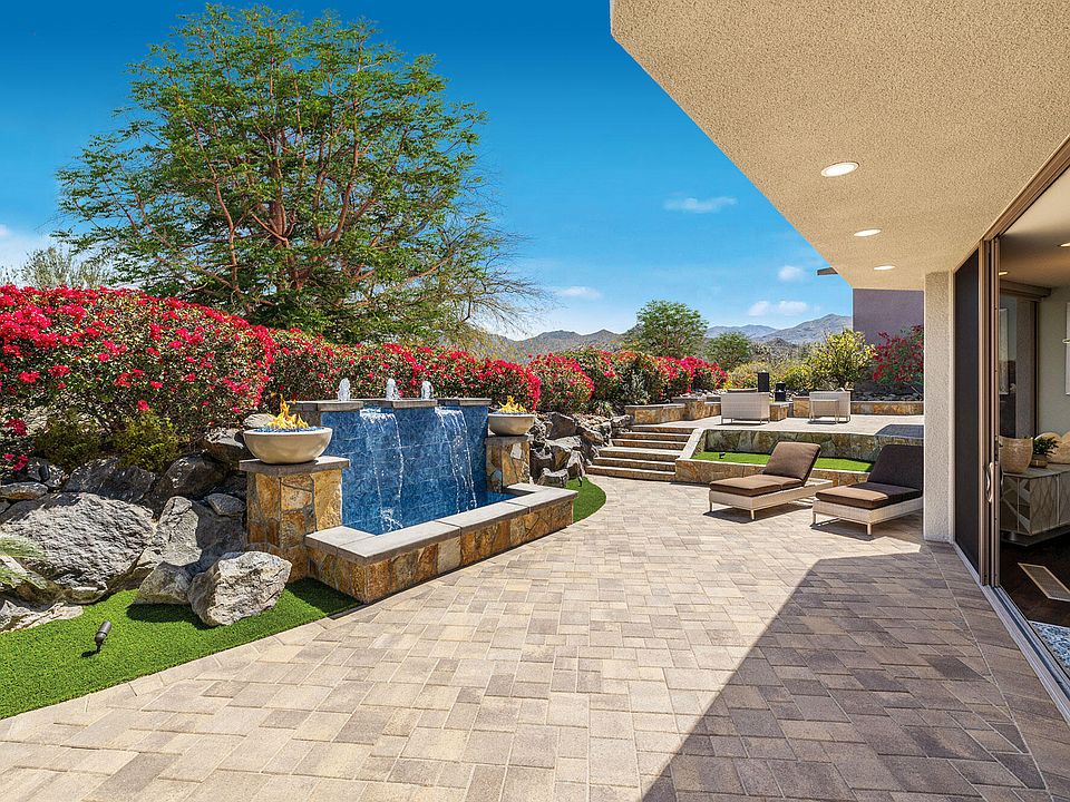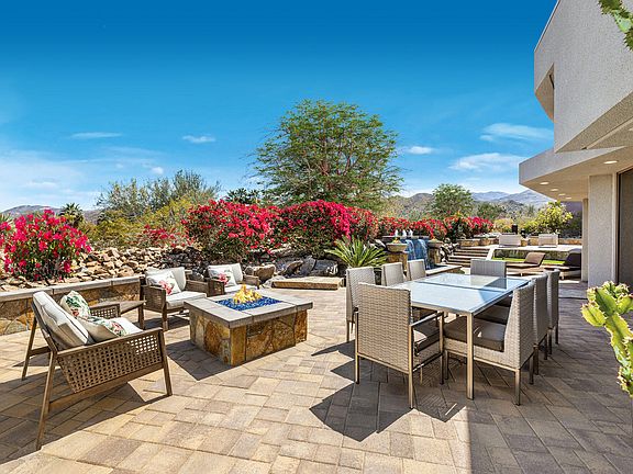 This 3 bedroom home includes a Great Room with custom leather furnishings, designer porcelain wood flooring, media center with two televisions, honed Bohemian limestone book-matched fireplace, access to back entertainment patio with new center waterfall featuring 2 fire bowls and 2 firepits. Chef's Kitchen offers quartz countertops, Thermador 5-burner range, double ovens, microwave, dishwasher, SubZero side-by-side refrigerator, walk-in pantry, 100-bottle wine refrigerator, island seating for four, convenient dining room Step-up Master Suite with custom wall treatment, sitting area and private patio with firepit surrounded by lush landscape; Master Bath offers separate his and her vanity areas, shower, spa tub with fireplace, walk-in closet and private entrance to front pool and spa. Additional Features include two car plus golf cart garage with ample storage, workbench and epoxy floor; upgraded electronics, Bohemian limestone flooring, gorgeous circular powder room and laundry room.