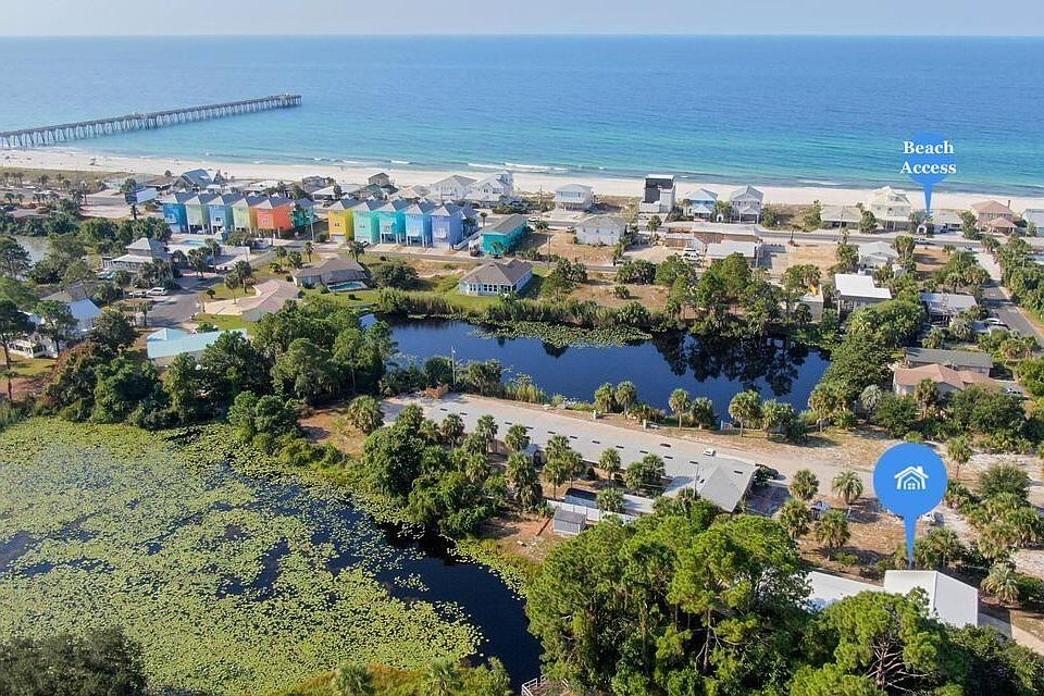 -**Short walk to the Gulf of Mexico** This Beautiful spacious 3 BR. 2 BA. home with open floor plan on Lullwater Lake and steps away from Panama City Beach. Enjoy your morning coffee in backyard on beautiful deck with sunrise views overlooking the lily pads. Home is block and brick and has been updated with flooring, lighting fixtures, fresh paint inside/outside and so much more. So close to Pier Park and Aaron Bessant Amphitheater to catch some live music. Pier Park also has a dog beach just minutes away. Roof and A/C installed in 2016 Don't miss out on this hidden Gem! This home is a must see. All dimensions are approx. Short term rentals are not allowed.