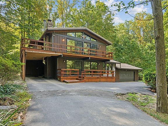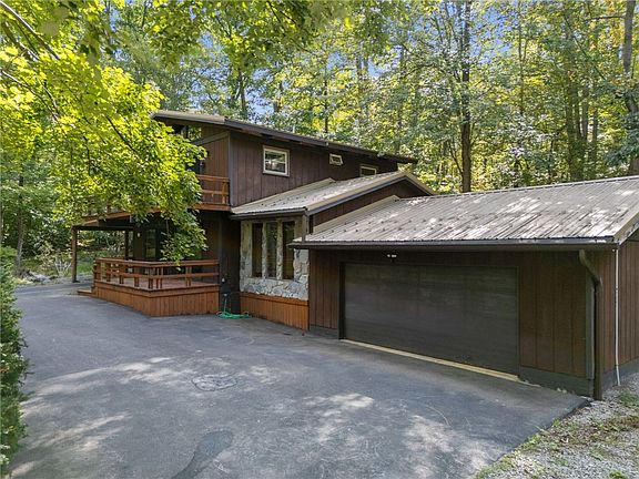 Welcome to 112 Larch Road in the desirable Bear Rocks Community! This captivating home checks every box—privacy, natural beauty, and breathtaking scenery on just under 2 acres. The lower level welcomes you with a warm, inviting family room showcasing rich woodwork, a charming wood-burning stove that can heat the entire home, and expansive sliding glass doors framing stunning wooded views. Off the family room is a bonus room with access to a peaceful deck overlooking the back of the property. This level also offers the 3rd bedroom, full bath, laundry room, and access to the 2-car attached garage. Upstairs, the open floor plan blends the kitchen and living room with continued thoughtful details, abundant natural light, and sliding doors leading to a wrap-around deck, perfect for taking in the views. The master suite has private deck access, while a second bedroom and full bath complete this level. Added features include a metal roof (8 years), appliances, and cedar-ceiling carport.