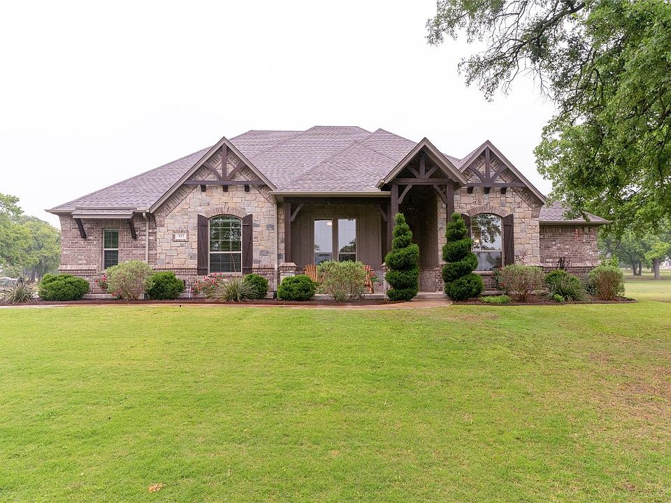 This stunning 3-3-3 home in the Las Brisas community is the ultimate dream home! The exterior boasts breathtaking landscaping and a serene stocked pond, perfect for relaxing or fishing. Entertain guests or unwind on the covered patio with a stone fireplace and TV connections. The chef's kitchen is a masterpiece with stone accents, cedar beams, granite countertops, double ovens, and an oversized island. The exquisite master suite has an ensuite bathroom with a walk-through shower, a large free-standing tub, and a walk-in closet with two chests of drawers. Other features include a water filter and softener system, instant hot water, hand-scraped hardwood floors, wood-look tile, 8’ interior doors, and crown moulding throughout. Enjoy charming accents, like a brick accent wall in the study and large windows providing natural light and a breathtaking view of the pond and yard. Don't miss out on this stunning home! Pictures to come April 27.