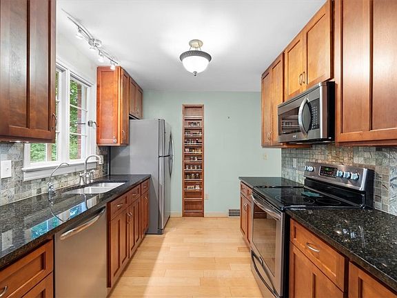 Welcome home to 112 Lillian Road - full of charm & pristine updates! Approaching the front door, notice a spacious lawn w/ abundant flowers & trees to gather cuttings from and vintage blue mailbox. First floor features hardwood floors, cozy fireplace, kitchen w/ SS Appliances, granite countertops, 2 bedrooms, full bath, & ample storage closets. LR/DR picture hanging rail + lighting for gallery-like displays. The sunroom, balcony and patio provide pleasant bird-viewing lookouts. Upstairs, the Primary boasts soaking tub, shower, & river stone accented ensuite, walk-in closet, & storage cubbies. Lower level: Integral garage, bright basement (pottery/craft studio). Enjoy grilling & yard games on the flat backyard ~ great for hosting.