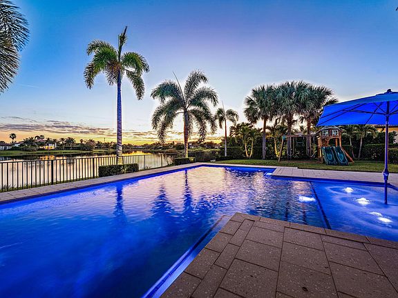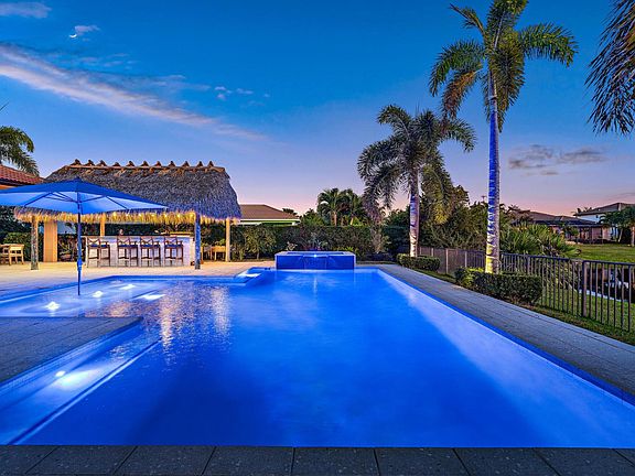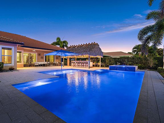 EXQUISITE, lakefront Stockton model home situated in the highly sought-after gated community of Rialto in Jupiter. This single-story CBS home offers 4 bedrooms + office, 3 full baths, a spacious 3-car garage, and 3,046 square feet of living space. Set on a .34-acre lot with beautifully landscaped surroundings for ultimate privacy, this home boasts direct lake views, a modern heated pool with spa/hot tub, and a fully equipped summer kitchen under a charming Tiki hut--perfect for entertaining. Crown molding, high ceilings, and custom trim details throughout make this former model home truly stand out.As you enter, you're greeted by the open living room with stunning views of the pool and lake. Adjacent is a formal dining room with elegant tray ceilings and a home office, offering the perfect balance of function and style. At the heart of the home is the chef's kitchen, featuring freshly resurfaced white wood cabinets, sleek black granite countertops, stainless steel GE appliances, and a large pantry. The kitchen opens seamlessly to the second living space and breakfast nook, with huge windows showcasing breathtaking lake views.