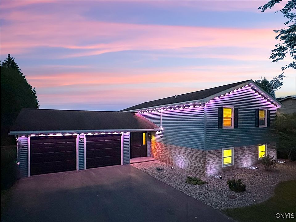 Outside, the home transforms into an entertainer’s dream. The backyard oasis is beautifully landscaped and includes a swimming pool, an extra-thick concrete patio built to accommodate a hot tub, and a campground-style firepit area perfect for gatherings. A custom pavilion with a bar and mounted TV creates a fantastic space to relax while enjoying the unobstructed view of the baseball field just beyond the property. Govee lighting installed in the soffits adds an ambient glow that elevates the home's exterior appeal at night.