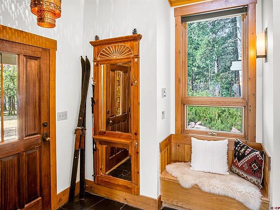 Custom Falls Creek Ranch Home with Panoramic Animas Valley Views Perched on a rim lot, this stunning Falls Creek Ranch home offers the feeling of living in a treehouse, with breathtaking views from every room through expansive walls of windows. A newly installed, two-level redwood deck extends from the main floor, perfect for outdoor relaxation and entertaining. The freshly painted exterior enhances the home's charm and curb appeal. **Main Level:** The main level features elegant slate flooring throughout, leading you through a graceful foyer with a custom copper light fixture and built-in bench. The great room, anchored by a striking moss rock fireplace, flows seamlessly into the dining area. The kitchen is a chef's dream, boasting a large island, built-in bar, and custom china cabinet as well as stainless appliances and bamboo countertops. Completing this level are a half bath and a versatile office or artist's studio space, which could easily serve as a fourth bedroom. **Upstairs:** The primary suite is a private retreat, with its own deck overlooking the Animas Valley. The remodeled bathroom is a sanctuary, featuring Italian faucets and sinks, mosaic tiles inspired by nature, cork flooring, a vessel soaking tub, and access to a second deck. **Lower Level:** The lower level includes two additional bedrooms, a shared bath, a storage room, and a laundry area with a convenient laundry chute. Multiple large closets provide ample storage space. **Exterior:** The home's exterior is a harmonious blend of wood and stone siding, complemented by metal-clad windows, a metal roof, and a combination of redwood and Trex decking. A two-car garage provides additional convenience. Located within Falls Creek Ranch, this property offers a truly unique lifestyle. Each home is situated on a circular acre of land, with shared access to an expansive 900-acre common property. Residents enjoy exclusive amenities, including numerous hiking trails, a private lake with a beach, horse corrals, and a tennis court. The ranch is surrounded by millions of acres of National Forest, ensuring unparalleled tranquility and protection from future developments.