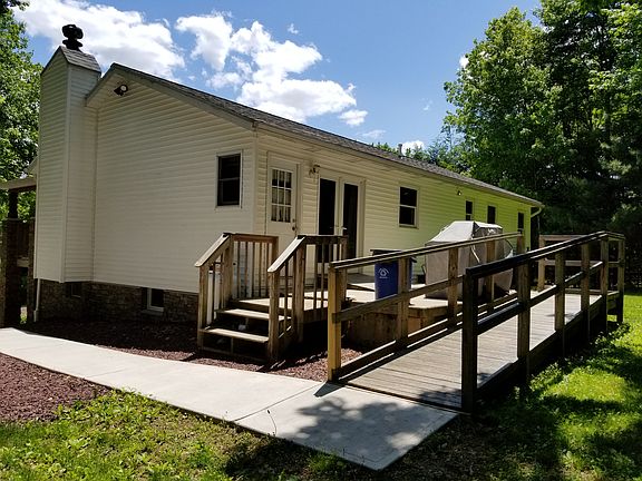 Privacy abounds in this 4 Bedroom 3 Bathroom Raised Ranch. Full Finished Basement with Walkout to Concrete Patio. 2 Heating Systems (Oil AND Outdoor Wood Furnace). The Oversized (16' x 28') Stone Accented Covered Front Deck off Living Room assures Hours of Outdoor Entertaining throughout Most of the Year. Kitchen/Dining area has French Door leading to Back Deck. Handicap Accessible via Ramp on Back of Home. Extras Included: Patio Furniture (2 Separate Seating Areas with Fire Pit in Bar Height Set), Fire Resistant Gun Safe in Basement and Upright Freezer in Basement. Detached 1 Plus Car Garage. Need More? How about a 540 Square Foot Guest House that has been sheetrocked and is ready to finish. Needs some spackle, paint, trim and flooring and would be ready to live in!