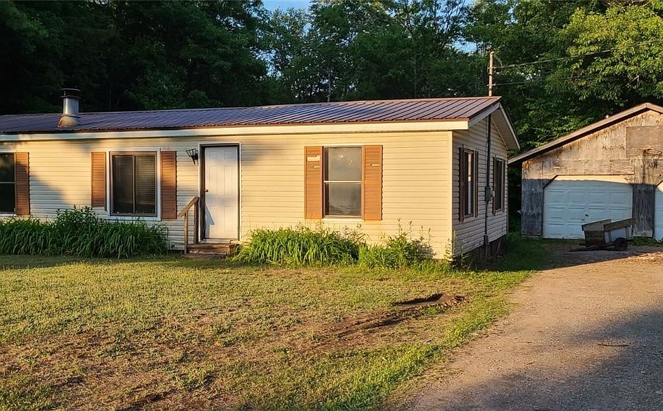An affordable home, low taxes, and a place to make your own!! This manufactured home sits right outside of town with almost an acre of land. Cozy setting as you pull up to the home with a spacious front and back yard. A two stall garage with electric. The back porch is the whole length of home for those peaceful coffee mornings or watching the kids play in the yard. The land has a nice perimeter of woods around it for that private country living you've been longing for. Interior has so much character with knotty pine walls in the kitchen, dining, and living room space, along with a woodstove for those cold winter nights. This home has 3 bedrooms and 2 full bath. New furnace in 2023 with a drilled well and septic. Bring your imagination and your stamp to put on it!! Priced to sell!!