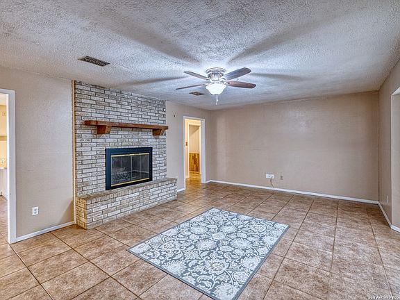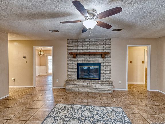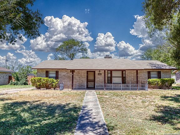 Tucked just south of town in a peaceful, well-kept neighborhood, this 3-bedroom brick home combines a country feel with city convenience. Built in 1979, it offers 1,595 sq. ft. of comfortable living space on a tree-shaded 0.30-acre lot. Inside, the living room features a bay window and a cozy brick fireplace. The kitchen is both functional and inviting with a mix of open and closed shelving, a breakfast bar, and French doors in the dining area that open to the back patio. All appliances convey-including cooktop, in-wall oven, microwave, refrigerator, dishwasher, washer, and dryer-so it's ready for move-in from day one. The primary suite includes a remodeled bathroom with updated countertop, fixtures, and tub-shower combo. Two additional bedrooms, each with ceiling fans, share a stylish hallway bath highlighted by granite counters, ornamental cabinetry, and a colonial-style mirror. Ceramic tile runs through the main living areas while bedrooms feature plush carpeting. Outdoors, the property is set up for both relaxation and play with a storage shed, children's playset, and privacy fencing on three sides. Parking is plentiful with a finished two-car garage (complete with ceiling fans, flooring, and a window unit-perfect for a game room, workshop, or gym), plus an attached two-car carport and asphalt rear drive with an electric gate. All of this is just minutes from H-E-B, the new hospital, and Southwest Texas Junior College, making this home an ideal blend of charm, comfort, and convenience.
